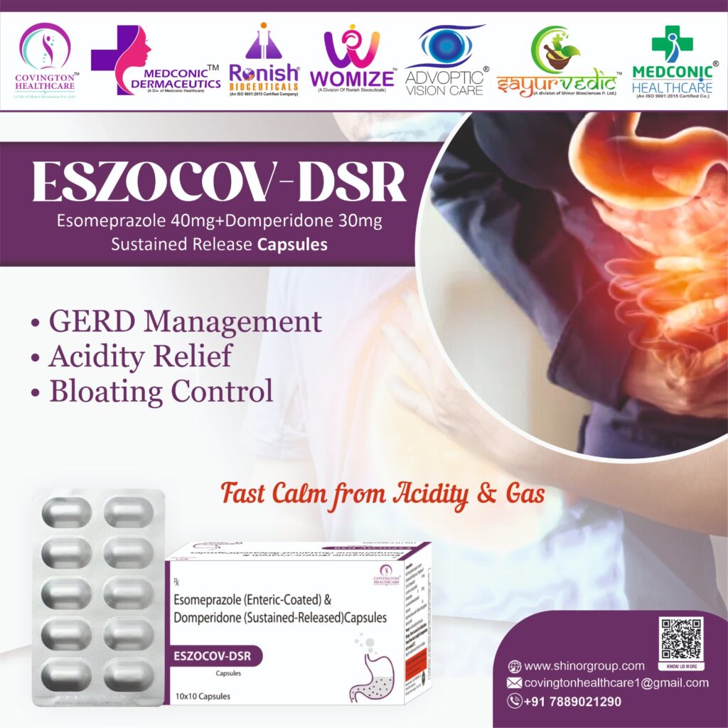 ESZOCOV DSR – ESOMEPRAZOLE and DOMPERIDONE CAPSULES contain two key ingredients that work together to manage acidity issues. The formulation includes esomeprazole 40 and domperidone 30, making it effective for people who experience severe and frequent acid-related concerns. The use of esomeprazole 40mg and domperidone 30mg improves digestion, controls acid, and reduces discomfort in the stomach.
